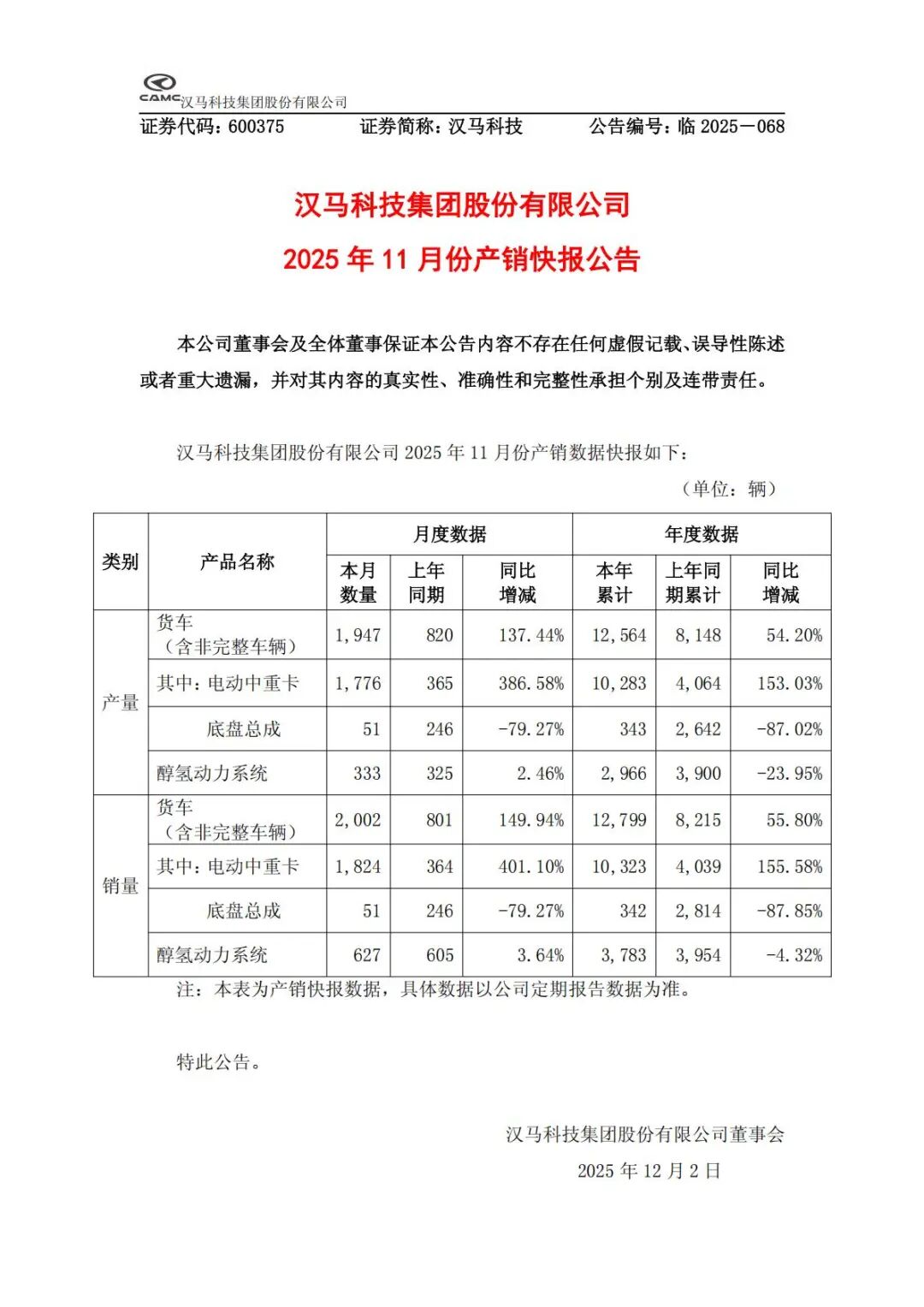 除了整车业务,2025年11月,汉马科技醇氢动力外销量同比增长251.06%,1-11月累计外销同比增长159.02%,为公司高质量发展的开辟出第二增长曲线。