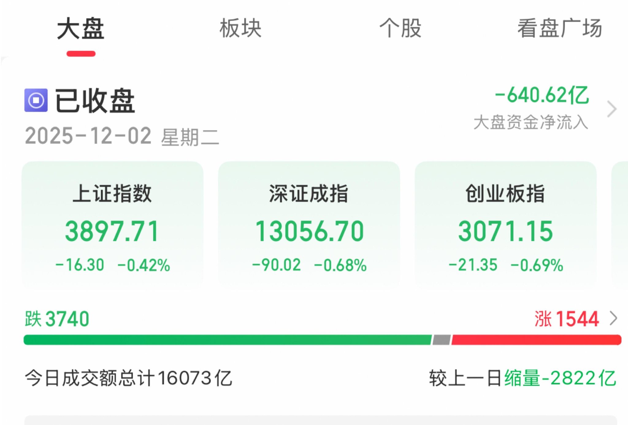 A股三大指数今日集体调整,截至收盘,上证指数跌0.42%,深证成指跌0.68%,创业板指跌0.69%,北证50跌0.76%。沪深京三市全天成交额16073亿元,较上日缩量2822亿元。全市场超3700只个股下跌。