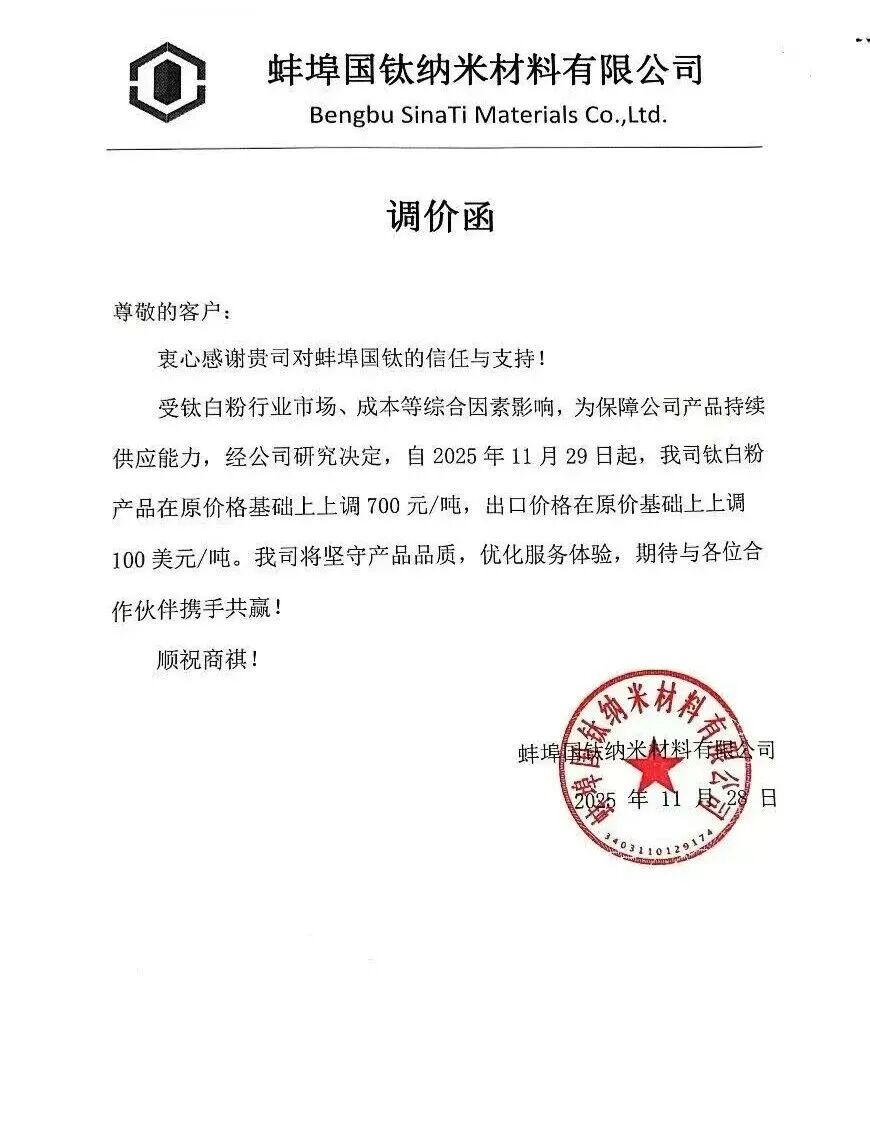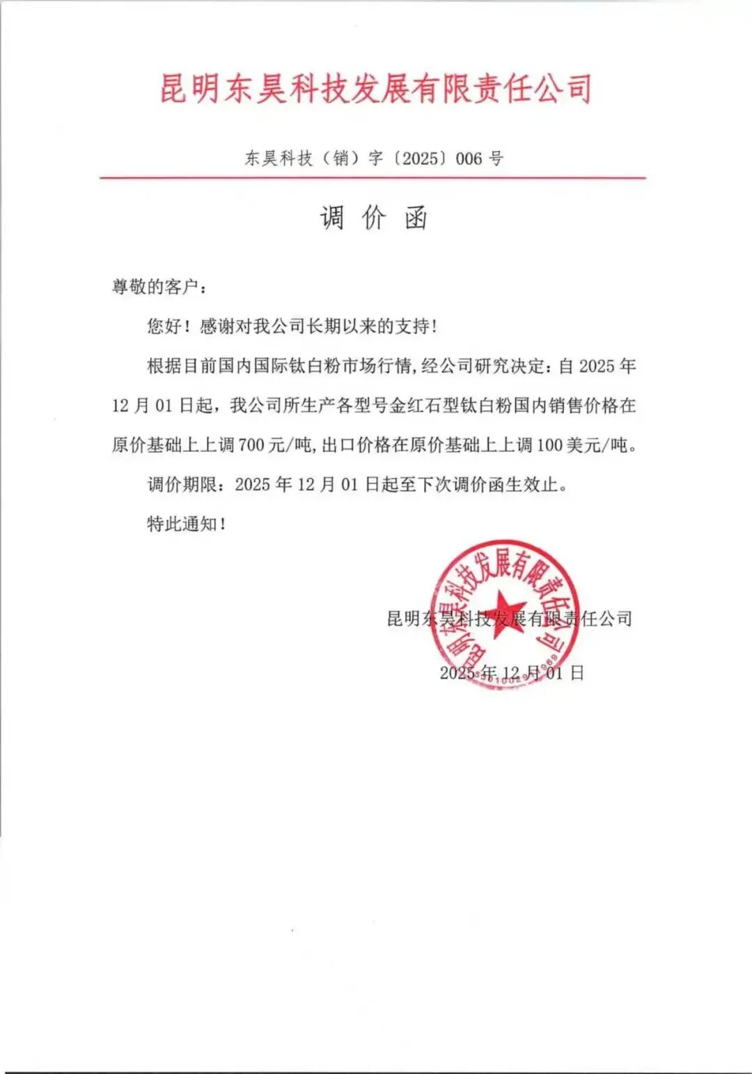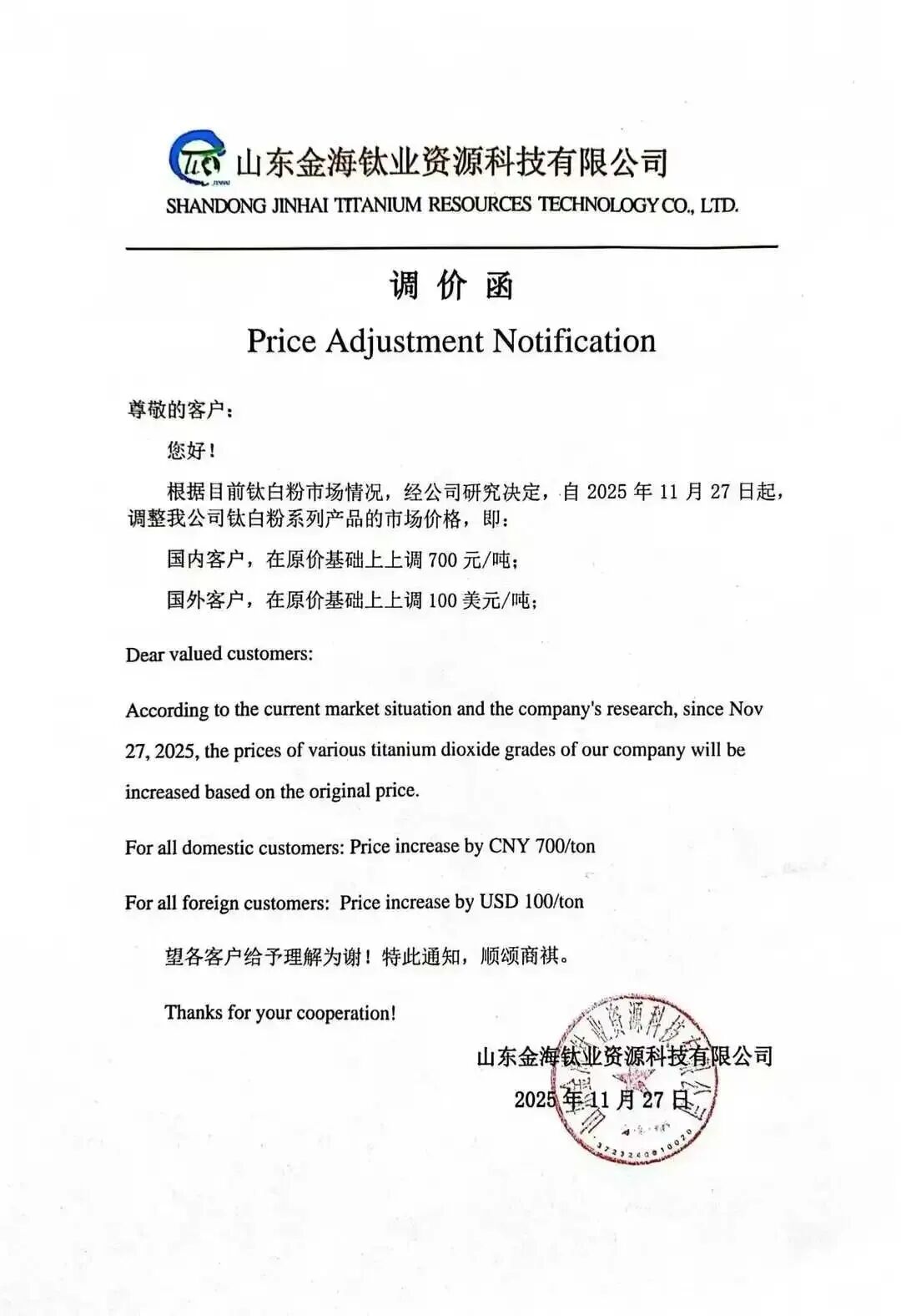 这一举措迅速引发连锁反应,山东道恩钛业、山东金海钛业、广西蓝星大华、南京钛白化工等多家重点企业相继跟进,纷纷发布类似调价通知,标志着本轮钛白粉价格全面上涨的正式开启!