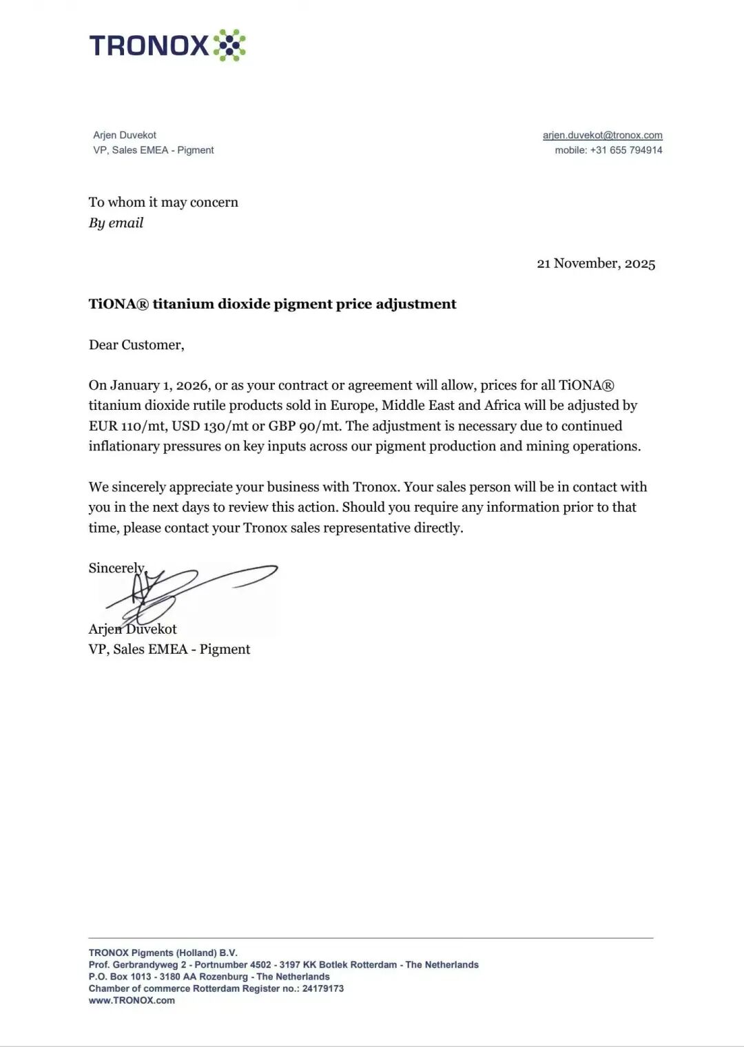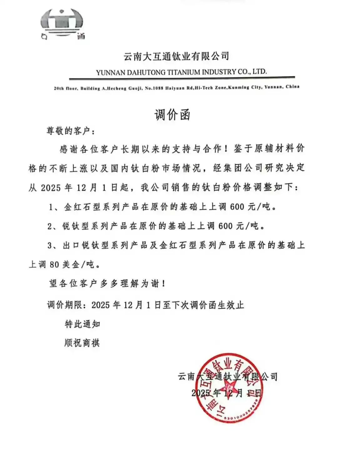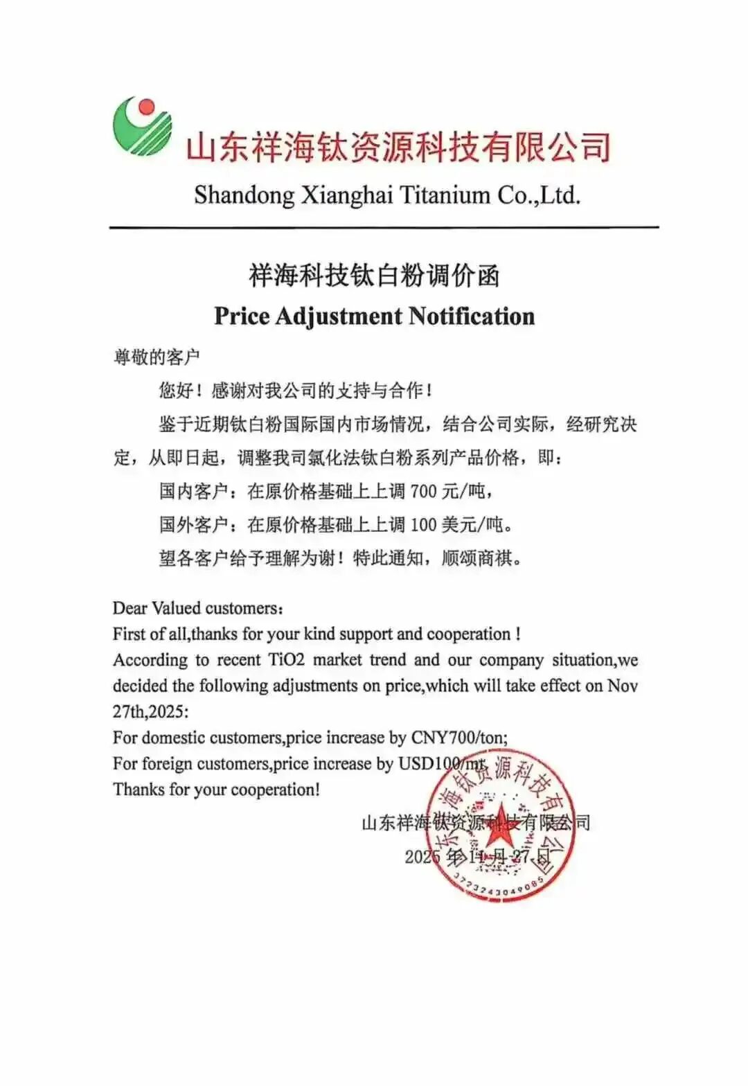 这一举措迅速引发连锁反应,山东道恩钛业、山东金海钛业、广西蓝星大华、南京钛白化工等多家重点企业相继跟进,纷纷发布类似调价通知,标志着本轮钛白粉价格全面上涨的正式开启!