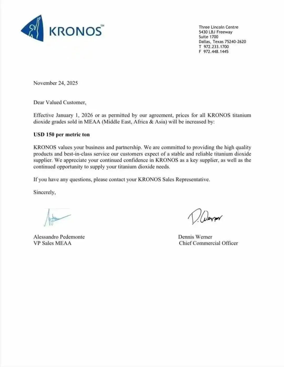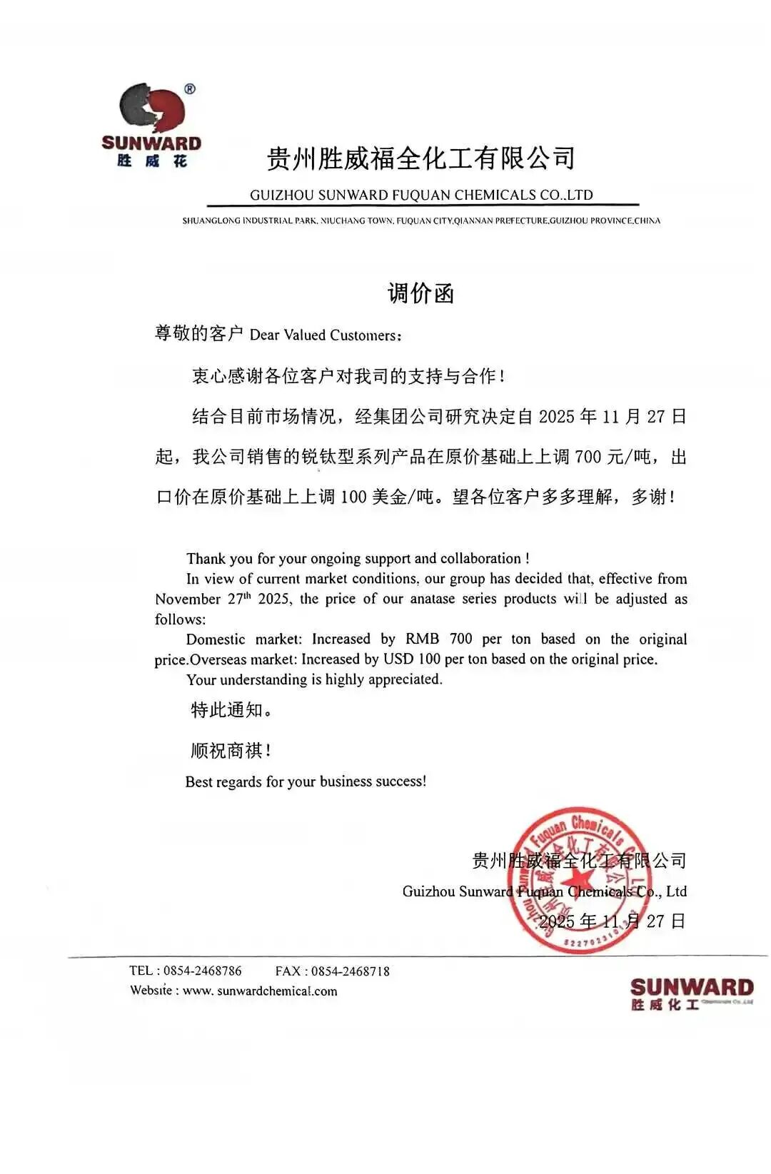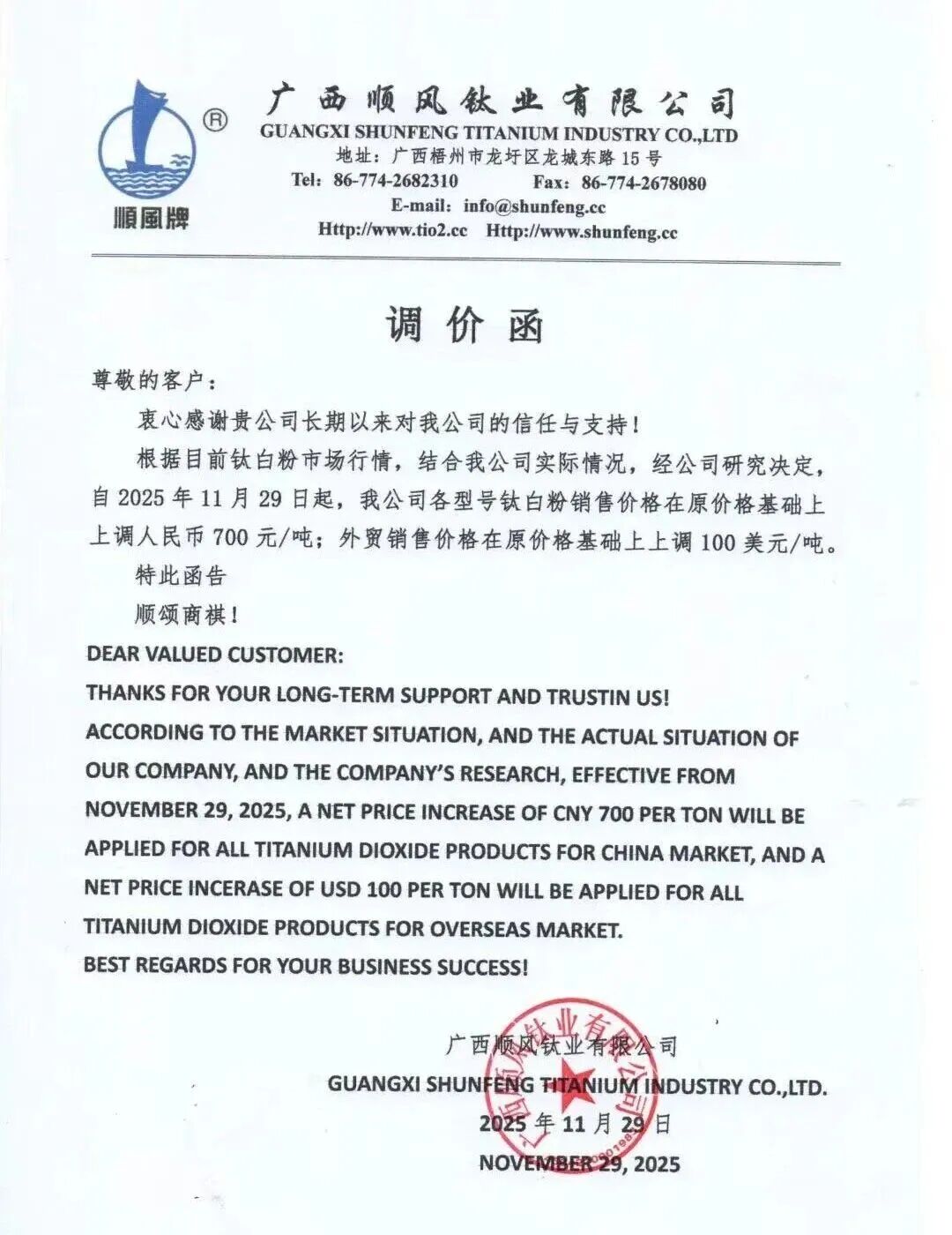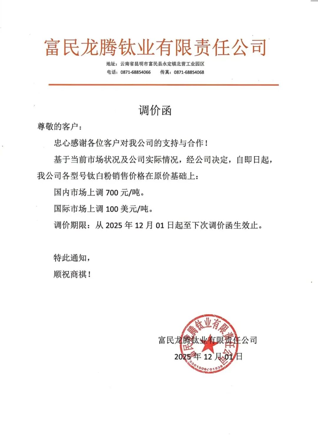 2025年11月下旬,中国钛白粉行业迎来一场突如其来的价格调整风暴。作为行业龙头的龙佰集团率先于11月26日发布调价函,宣布自即日起对旗下所有钛白粉产品进行提价,国内销售价格每吨上调700元人民币,国际市场则每吨上调100美元。