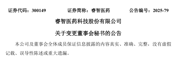 12月1日,睿智医药公告,因工作调动,许剑先生不再担任董事会秘书职务。
