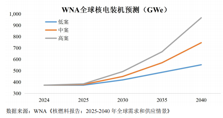 历史欠账尚未解决,新增需求已然涌现。WNA在其发布的《核燃料报告:2025-2040年全球需求和供应情景》中预测,在参考情景(中案)中,到2040年,全球核电装机容量将达到746GWe,全球反应堆铀需求预计将增加至15.05万tU。若按高增长情景(高案),装机容量将达到966GWe,铀需求量将飙升至20.46万tU。在全球能源清洁转型和核电加速建设发展的推动下,天然铀供需缺口预计长期存在。