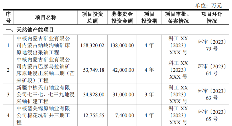 因此,国内铀矿产能项目是中国铀业本次募投的核心,包括“中核内蒙古矿业有限公司内蒙古纳岭沟铀矿床原地浸出采铀工程”“中核内蒙古矿业有限公司内蒙古巴彦乌拉铀矿床原地浸出采铀二期(芒来矿段)工程”“新疆中核天山铀业有限公司七三七、七三九地浸采铀扩建工程”“中核韶关锦原铀业有限公司棉花坑矿井三期工程”四大项目,这些项目建成达产后,将显著提升国内天然铀的生产与供应能力,优化技术工艺水平,满足国家铀产能布局调整的战略需求,有效降低对外依存度,筑牢国内供应的“压舱石”。