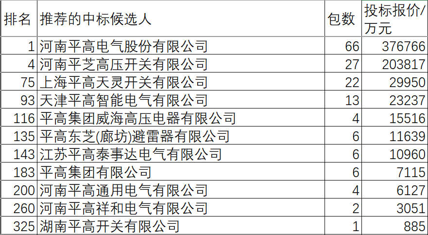 第93的天津平高智能电气有限公司中13包开关柜23237万元。