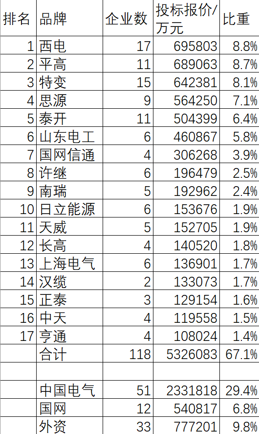 249家中标企业中,西电、平高、特变、思源、泰开、山东电工、国网信通、许继、南瑞、日立能源、天威、长高、上海电气、汉缆、正泰、中天、亨通17个领先品牌的118家企业合计中5326083万元,占总金额的67.1%,品牌集中度一般。