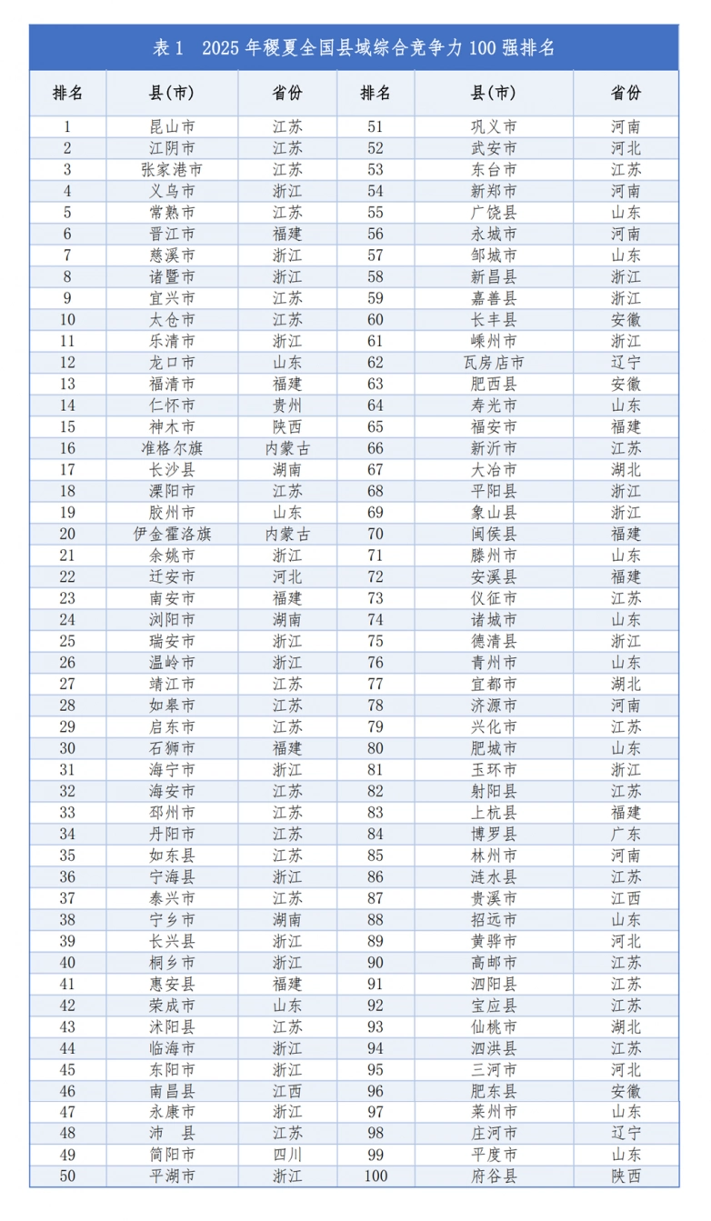 华夏时报消息,12月2日,稷夏全国县域综合竞争力和投资潜力百强县市榜单发布。2025年全国综合竞争力前10强县(市)分别是昆山市、江阴市、张家港市、义乌市、常熟市、晋江市、慈溪市、诸暨市、宜兴市、太仓市。