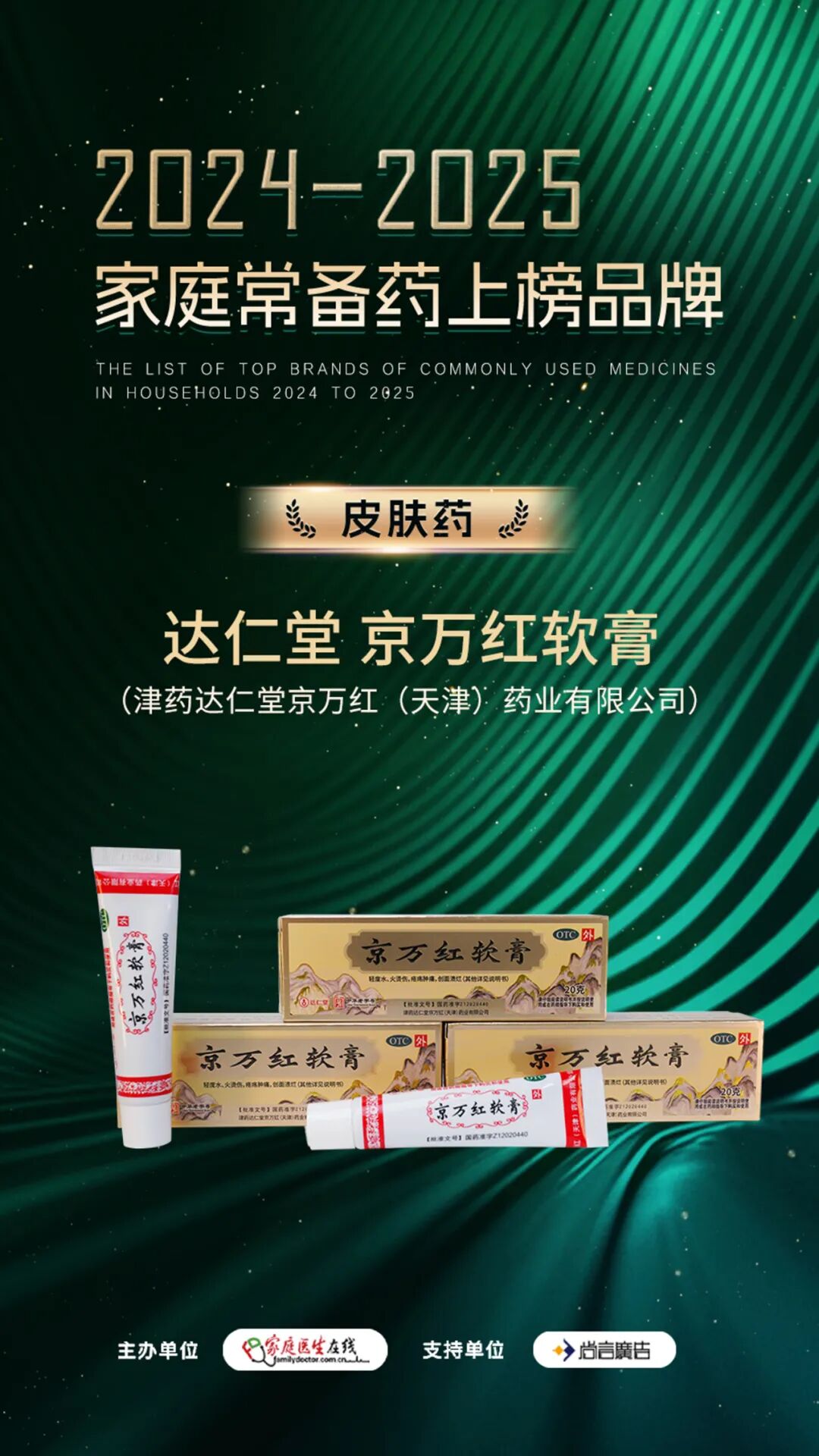 近日,“2024-2025家庭常备药、家庭常备营养食品/保健品、家庭常备医疗器械及消毒用品上榜品牌”揭晓,津药达仁堂的独家产品——京万红软膏荣登 “中国家庭常备药皮肤科用药榜”。