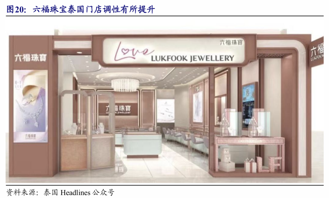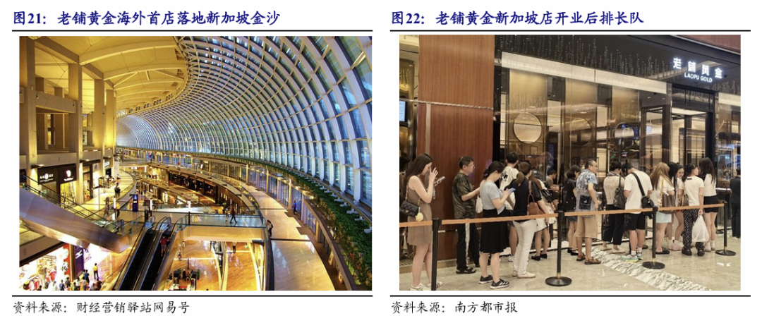 以老铺黄金、周大福、六福、潮宏基等品牌为代表,率先发力东南亚市场。周大福、六福等传统品牌率先走出国内,在泰国、越南等东南亚国家进行布局,出海门店整体调性相比国内有所提升;潮宏基2024年开始也在马来西亚、泰国等地开出门店、销售良好。此外,高端黄金领域,老铺黄金2025年6月也在新加坡顶级商业体滨海湾金沙酒店开出海外首店,选址优越、产品结构高端,开业后吸引大量海外客户到店体验,帮助品牌国际影响力进一步提升。