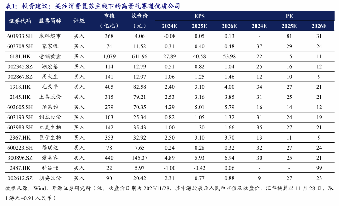 投资主线3:关注满足情绪价值和安全成分创新的国货美妆品牌。国货美妆品牌乘国潮之风崛起,捕捉消费者情绪价值锚点,加速产品迭代、提升竞争力。建议关注:(1)拥有卓越的平台化多品牌综合运营能力的公司,重点推荐珀莱雅、上美股份、丸美生物、巨子生物、贝泰妮等;(2)围绕中国传统美学理念布局的高端美妆品牌,重点推荐毛戈平;(3)个护家清全面开花、嗅觉经济打开全域用香场景,重点推荐润本股份,受益标的若羽臣、上海家化等。