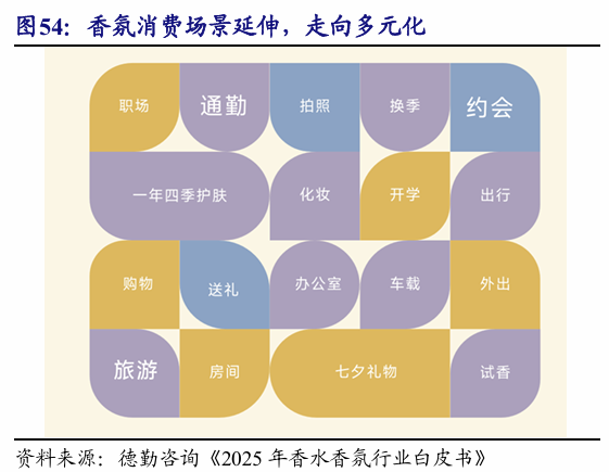新消费范式以情绪价值和自我表达为核心,重塑香氛产品的市场角色。(1)悦己需求为嗅觉经济核心驱动力:香氛产品功能已从传统社交礼仪或身份象征,转变为服务个人精神需求的工具,用于愉悦自我、调节情绪和缓解压力。《2025年香水香氛行业白皮书》数据显示,超过40%的消费者会根据心情、社交和日常等选择香水,部分小众香调搜索增速超50%,香氛已从小众奢侈品转变为大众日用品。这种从“悦人”到“悦己”的转变,是驱动市场增长最根本的心理动因。(2)消费场景与群体多元化:随着悦己观念深化,用香也不再局限于正式场合,根据一项2023年对972名消费者调研显示,用香已渗透到休闲聚会(75%的消费者,下同)、日常工作(51%)和运动健身(20%)等生活方方面面。消费群体边界也在同步扩大,男性客群以及Z世代年轻消费者成为两股新势力。