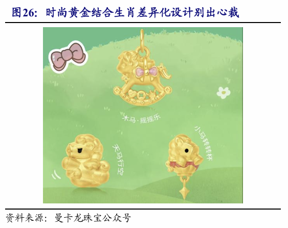 情绪消费兴起叠加金价持续上行,传统渠道逻辑削弱、产品/品牌型公司崛起。黄金珠宝行业正在发生深刻变革,早期“渠道为王”,现在“消费者洞察+差异化产品力”成为核心竞争力。一方面,年轻消费群体崛起,需求端呈现从单一资产配置和婚庆需求向情绪价值需求转向,悦己、社交、文化认同等多元需求催生细分赛道机会,而供给端逐渐饱和且高度同质化带来价格竞争内卷,因此具备差异化设计且自带流量的产品就更显稀缺性。另一方面,金价持续上行背景下,加盟商拿货成本提高,传统铺货模式利润空间被挤压,也倒逼行业从粗放经营转向精细化和差异化竞争。因此,具备差异化设计能力和精准消费者洞察的产品型公司才更有望突围,在此基础上,若能有效把握社交媒体营销资源和流量红利,则有望更上一层楼。