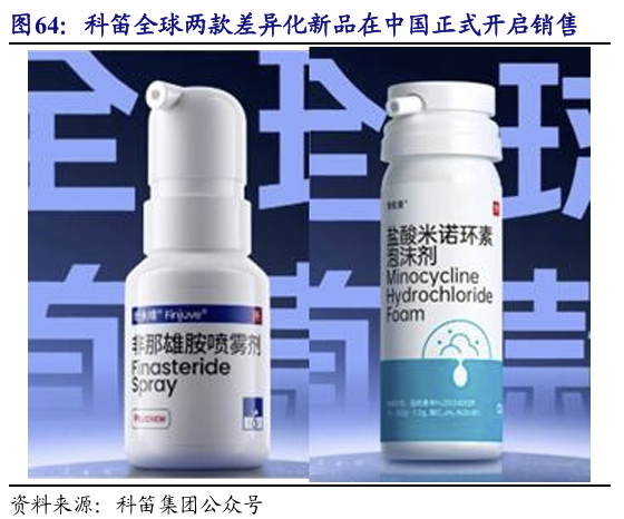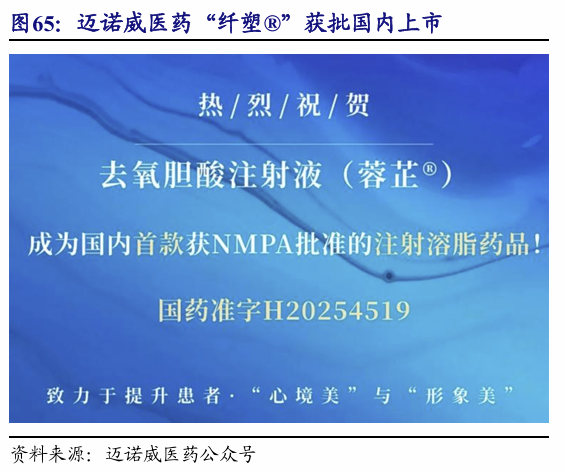 差异化产品布局夯实企业竞争护城河。(1)2025年10月科笛集团外用非那雄胺喷雾剂纷永维®Finjuve®、4%盐酸米诺环素泡沫剂安佐清®在中国正式开启销售,分别为全球首个且唯一用于雄激素性脱发治疗的外用非那雄胺产品、全球首款且唯一的外用4%盐酸米诺环素泡沫剂,临床差异化优势显著,有望打开销售市场。(2)2025年6月,迈诺威医药研发的去氧胆酸注射液“纤塑®”正式获批上市,产品适用于双下巴、腹部等顽固脂肪堆积区域,成为国内首款合规溶脂针产品。