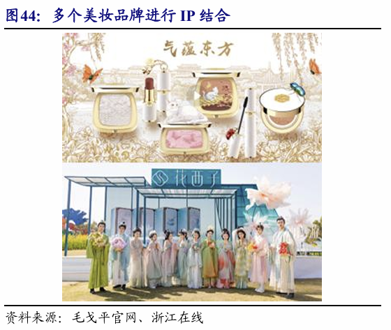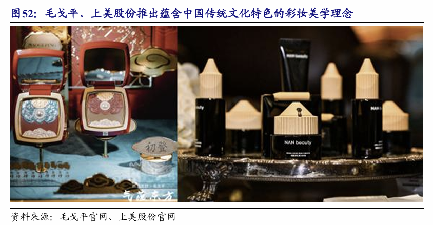 国货品牌机遇:立足文化根基,精准捕捉“情绪红利”。根据Frost&Sullivan数据,在情绪价值新战场,国货品牌凭借对本土文化的深刻理解和快速市场反应,成功抓住民心红利,市占率持续提升。国货品牌更擅长将产品与本土消费者文化自信、生活场景相结合:(1)文化叙事:提供东方美学设计(毛戈平、花西子、彩棠)或与传统节日、IP的结合,唤起消费者文化认同感;(2)群体共鸣:针对“熬夜党”、“打工人”等特定群体的焦虑点,推出能引发强烈情感共鸣的营销内容和产品组合。