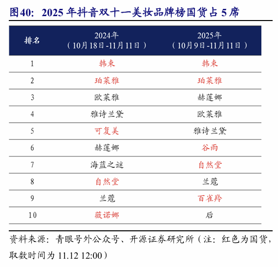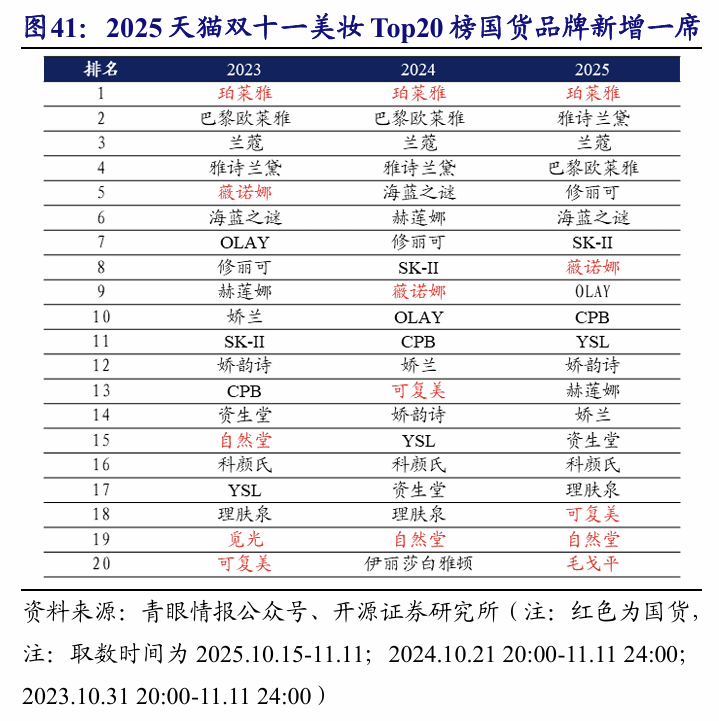 国内彩妆品牌百花齐放,体现了中国传统文化的美学理念被市场持续认同。(1)毛戈平:专业高端国货品牌,依托大师IP的“东方光影”美学体系,以超级大单品构筑极深的心智壁垒,根据毛戈平招股书,其品牌是国内市场十五大高端美妆品牌中唯一的国货品牌。(2)珀莱雅:彩棠是珀莱雅集团的第二增长曲线,通过集团较强的运营能力将唐毅化妆师IP成功规模化,验证了“专业IP+集团赋能”的成功模式;2025年9月独家投资花知晓,完成在彩妆线上的进一步布局。(3)上美股份:NAN Beauty于2025年8月上市,首批产品9月9日在抖音平台正式上线,这也是上美推进“多品牌、全品类”战略的重要进展。