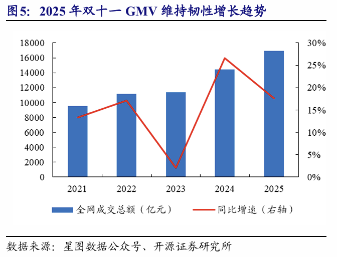 线上零售延续良好发展势头。2025年前三季度实物商品网上零售总额为9.15万亿元(+6.5%),其中吃/穿/用类商品分别同比+15.1%/+2.8%/+5.7%,维持良好增长势头。渗透率方面,前三季度实物商品网上零售额占社零比重为25.0%,维持在较高水平。电商购物节方面,根据星图数据统计,10月7日-11月11日双十一全网电商销售总额为16950亿元,较2024年增长14.2%。其中综合电商销售总额为16191亿元(+12.3%),即时零售销售额为670亿元(+138.4%),社区团购销售额为90亿元(-35.3%)。分平台看,天猫综合电商销售表现稳居榜首;京东官方宣称京东双十一成交额再创新高,下单用户数增长40%,订单量增长近60%;抖音官方发布抖音双十一多重玩法助力6.7万个品牌销售额翻倍,众多品牌销售额破亿。整体来看,2025年双十一电商平台促销周期显著拉长,大促走向新常态。