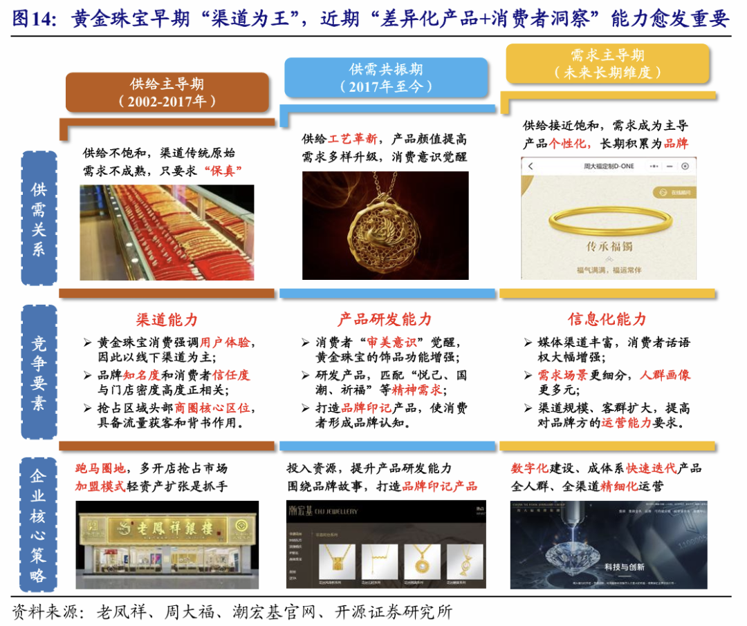 供给主导阶段,行业供不应求,品牌方核心策略是“渠道为王”跑马圈地。该阶段渠道相对原始,消费者需求也并不成熟,“保真”是核心诉求,因此渠道能力是行业核心竞争要素,头部企业多采取跑马圈地策略进行大规模加盟扩张,抢占市场。代表性案例包括:老凤祥推出省代模式,充分激发大商积极性;周大生瞄准下沉市场,以钻石镶嵌品类做出差异化;周大福优先抢占高线核心商圈,树立高端品牌形象。