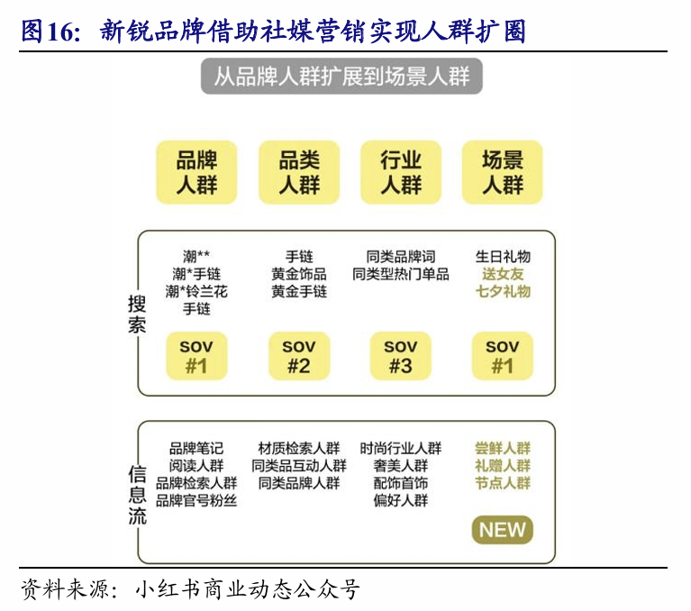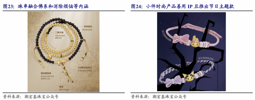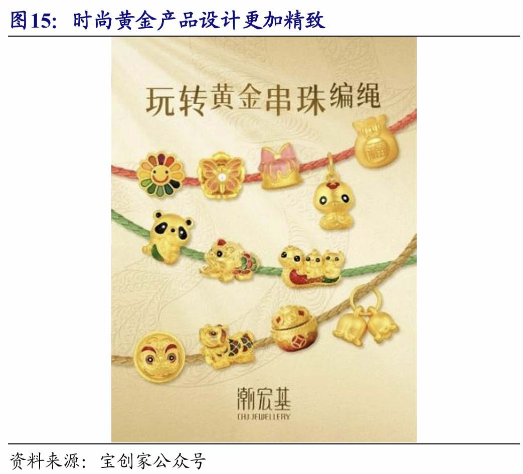 时尚黄金产品端具备重设计、轻量化、推新快的特点,适合社媒“种草”营销。与传统黄金相比,时尚黄金设计层面更注重年轻化表达,如融入国潮、动漫IP等元素,3D硬金等新工艺实现造型更加轻巧立体精致,同时产品整体克重轻、总价低、推新频率快。此外,时尚黄金产品特点适合社媒营销,通过定向“种草”在线上提前抢占消费者心智,为渠道不占优的新品牌带来弯道超车机会。