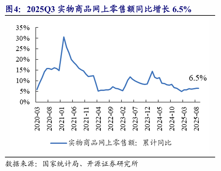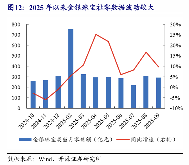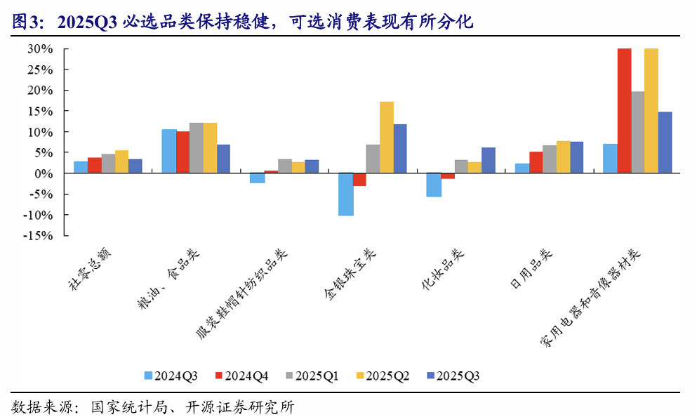 分品类看,商品消费中必选品类维持稳健,可选消费表现更佳。2025年以来,以粮油食品为代表的必选消费品维持平稳增长,可选消费品家用电器和音像器材类表现较好;2025Q3金银珠宝、服装鞋帽、化妆品分别同比+11.8%/+3.3%/+6.2%。10月化妆品、金银珠宝表现亮眼,分别同比+9.6%/+37.6%。