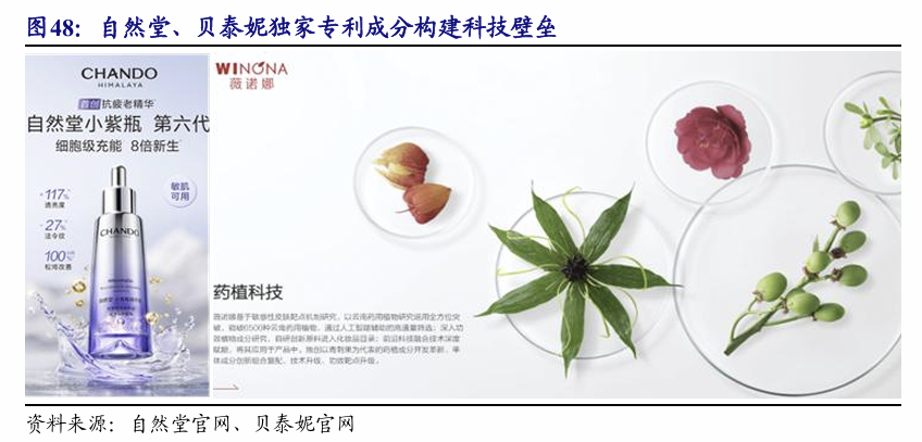 叙事是起点、独研是终局,已完成叙事积累,开始用独家专利成分构建科技壁垒的国货品牌或将受益。(1)自然堂:核心技术资产包含喜默因,是由喜马拉雅山脉发现的菌株开发的极地酵母,研究发现能大幅提升肌肤再生因子,采用该成分的大单品“小紫瓶精华液”至今已更新至第六代,截止2025年6月30日小紫瓶精华液的累计零售额已超8.7亿元。(2)贝泰妮:立足云南植物王国的地域优势,对高原特色植物提取物(如马齿苋、青刺果等)与敏感肌肤护理领域进行深度研究,掌握自主研发核心技术,树立行业标杆。