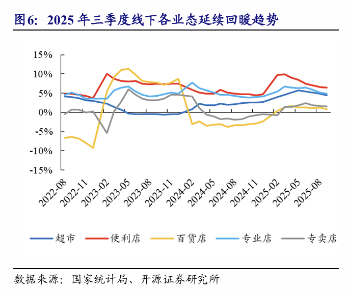 线下零售各业态均呈现边际回暖趋势。分业态看,2025Q3超市、便利店、百货店、专业店和品牌专卖店零售额同比分别+4.4%/+6.4%/+0.9%/+4.8%/+1.5%,各业态均呈现边际回暖趋势,其中便利店销售表现较强。国庆假期消费市场活力足,据税务局公布的增值税发票数据显示,国庆中秋假期商品消费和服务消费同比分别增长3.9%、7.6%;此外根据商务部商务大数据监测,2025年10月1日-10月7日,商务部重点监测的78个步行街(商圈)客流量、营业额同比分别增长8.8%、6.0%。