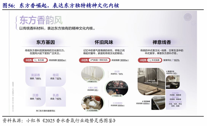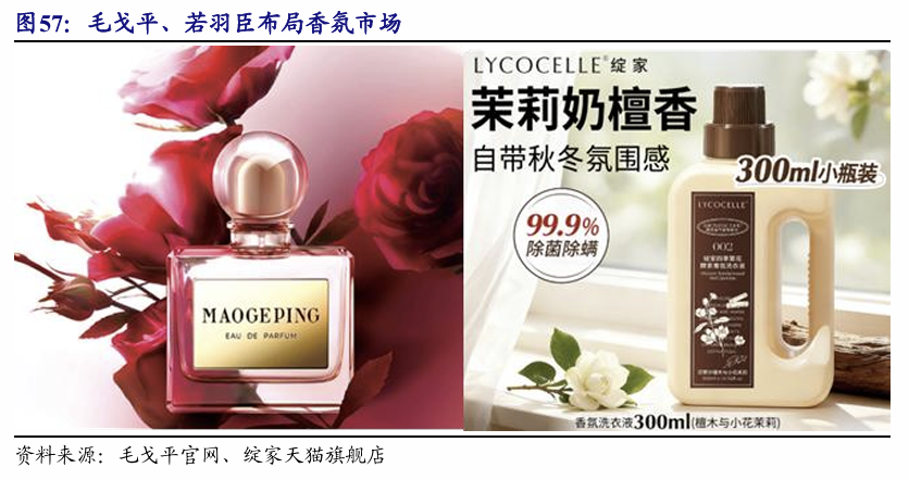 东方香崛起:文化自信催生本土机遇,毛戈平、若羽臣纷纷布局嗅觉市场。聚斯金德小说《香水》提到“谁掌握了气味,谁就掌握了人们的心”,国货品牌通过挖掘文化记忆与情感共鸣的独特故事,围绕东方香味等元素构建产品,将香气从单纯的嗅觉体验升华为一种文化表达和心理疗愈。(1)毛戈平:解构东方香水的新范式,推出了“国韵凝香”和“闻道东方”香水系列,打造了多款各具风韵的香型。(2)若羽臣:携绽家步入个护家清赛道,抓住了“香氛”这一掌握调性与客单价的核心卖点, 2025年首次与李佳琦在双11预售首日直播间相聚,单品六合一洗衣凝珠销量亮眼突破20万件。