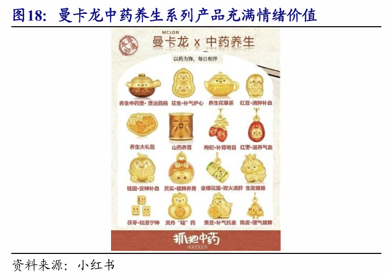 曼卡龙深刻洞察年轻消费者偏好,产品设计“癫”感十足。曼卡龙是兼具时尚感和东方审美的中式黄金品牌,注重产品设计差异化和品牌形象年轻化,其爆款产品以中药养生系列为代表,从年轻人压力释放和身心疗愈出发,提供情绪宣泄口,打造类似“黄金界Jellycat”的体验场景,消费者的购买“抓药”过程收获满满情绪价值。