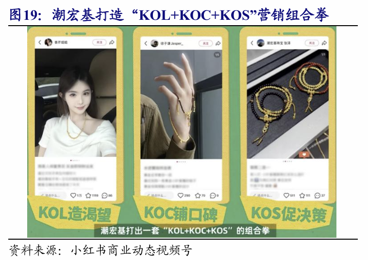 潮宏基借助小红书传播矩阵,打通“曝光→信任→销售转化”的营销全链路,持续产出流量爆款。相比抖音信息流转化的漏斗逻辑,小红书是反漏斗逻辑,强调精准人群定向,通过搜索种草+全平台转化,内容沉淀后,种草边际成本可以显著优化。潮宏基深耕小红书平台,借力“KOL+KOC+KOS”矩阵打法( KOL 曝光造渴望、KOC 渗透铺口碑、KOS 承接长尾流量促决策),有效建立了从品牌曝光到用户信任建立再到销售转化的全链路,将主推产品批量打造为“自带流量”的爆款,深受终端加盟商门店欢迎。