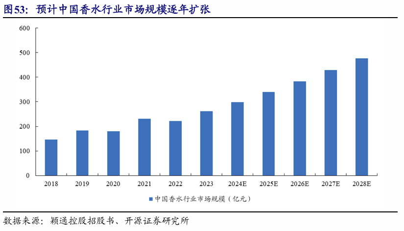嗅觉经济:从小众奢侈品到主流市场。(1)中国香水市场增速远超全球水平:根据颖通控股招股书,预计2028年中国香水市场规模将突破477亿元,预计2023-2028年复合增长率高达12.8%,而同期全球香水行业市场规模CAGR预计为3.5%。(2)低渗透率下的“蓝海”市场机遇:目前中国香氛市场渗透率较低,与欧美成熟市场差距较大,增长潜力突出。