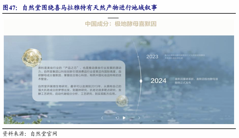 利用现代生物科技点化独特的天然资源,实现从讲故事到亮专利的转变。首先给出定义:地域叙事+生物科技,是以独特地理概念为品牌心智,并围绕该地域的天然产物进行生物科技研发,最终形成专利成分壁垒的化妆品类。以自然堂为例,(1)叙事驱动:喜马拉雅的品牌叙事(冰川水等自然资源)精准切中了消费者对“纯净、天然、安全”的心理诉求,是对品牌建立差异化认知、获取早期客户的基础;(2)科技驱动:随着认知的加深,单纯的产地故事已不足以支撑高客单价,市场竞争核心转向到能否将地域概念转化为独家专利功效成分,创造出如喜默因等这样的自主研发“原料芯片”。