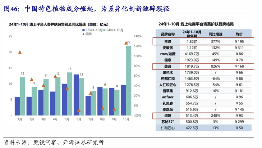 中国特色植物成分崛起:文化自信赋能的差异化路径。作为差异化创新的另一强大引擎,根植于本土文化的中国特色植物成分正乘“国潮”之风强势崛起。国货品牌通过现代科技手段验证并放大其传统功效,成功地将文化叙事转化为市场优势。根据魔镜洞察数据,2024年1-10月人参护肤品线上市场规模已达116亿元,同比增长39%;另一成分青蒿,虽整体市场体量尚在起步,但同时段销售额同比高增62%,玉泽品牌凭借对青蒿成分的精准运用,在同期实现377%的GMV同比增长。