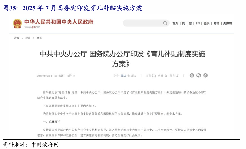 国家出台生育补贴政策,鼓励生育促进人口增长。2025年7月国务院办公厅印发《育儿补贴制度实施方案》,对3周岁以下婴幼儿每孩每年发放3600元补贴,此后多地育儿补贴审核提速。展望未来,合适的生育支持政策有望促进新生儿数量恢复增长。