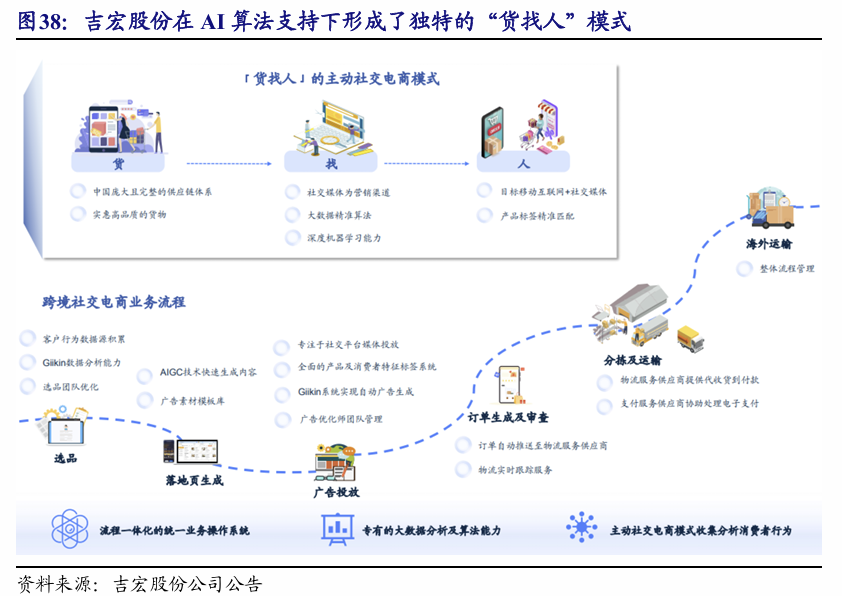 赛维时代、吉宏股份等跨境电商公司积极运用AI工具赋能,提升经营效率和竞争力。(1)赛维时代:公司基于“小前端+大中台”的全链路数字化能力,实现对品牌矩阵中各细分品类的高度复用和规模化赋能,未来有望逐步提升业务扩张效率和利润率水平。(2)吉宏股份:跨境电商业务通过AI算法实现精准客群定位,同时通过多平台投放策略,形成区别于传统电商的“货找人”主动社交电商模式,此外积极推进全球化布局和自有品牌孵化,综合竞争力有望稳步提升。