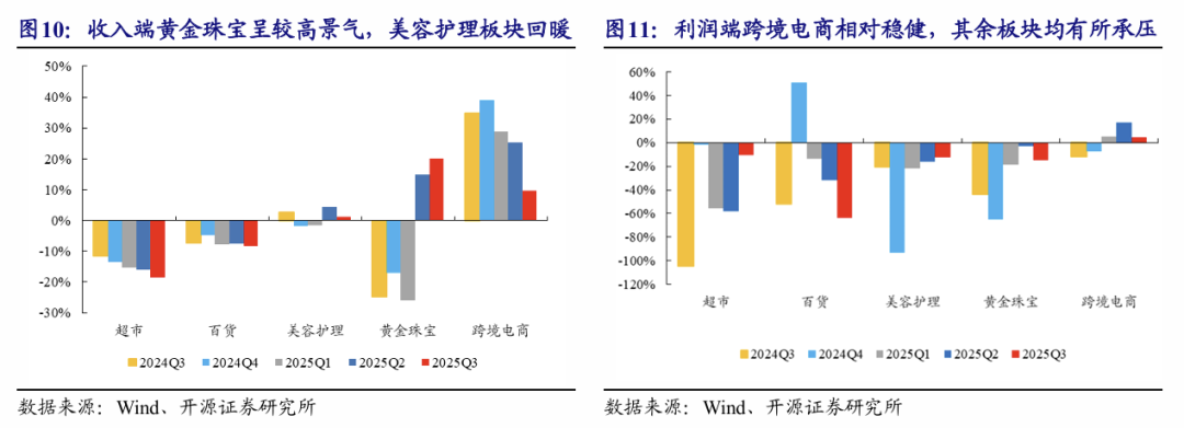 分板块看,收入端黄金珠宝呈现较高景气,利润端跨境电商相对稳健,其余板块均有所承压。收入端看,2025年以来超市、百货板块表现相对逊色;黄金珠宝板块二、三季度景气有所提升,2025Q1-Q3营收分别同比-26%/+15%/+20%;美容护理板块2025Q1-Q3营收同比分别-2%/+4%/+1%,相对稳健;跨境电商板块2025Q1-Q3营收同比分别+29%/+25%/+10%,保持相对较高景气。利润端看,2025Q3跨境电商板块利润端表现相对稳健,同比+4%,超市/百货/美容护理/黄金珠宝等板块均有所承压,2025Q3分别同比-10%/-64%/-12%/-14%。竞争格局方面,“情绪消费”相关公司经营业绩优于行业整体。情绪消费赛道相关优质品牌方在零售行业整体承压下,呈现出更强韧性,如黄金珠宝的老铺黄金、潮宏基,化妆品公司毛戈平、上美股份等,2025Q1-Q3经营业绩均增长良好。