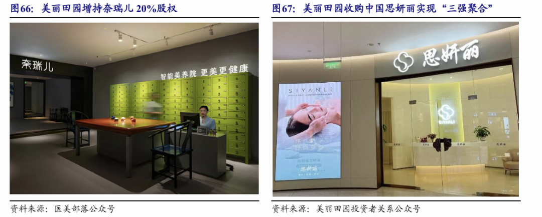 美丽田园持续并购实现“内生+外延”增长。美丽田园通过并购持续巩固龙头地位,拓展高端客群。2025年5月增持20%奈瑞儿股权至90%,奈瑞儿中医美养业务为公司带来协同效应,增持强化“双美+双保健”战略布局;2025年10月宣布战略收购高端生活美容品牌思妍丽,实现“美丽田园—奈瑞儿—思妍丽”三强聚合,巩固龙头地位同时为公司打开高质量流量入口,也实现对一线城市高端商圈覆盖度的进一步提升。公司通过并购持续拓展品牌矩阵,带来更充裕的客源,实现市场影响力提升。