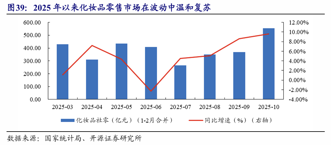 2025年以来,国内化妆品零售市场整体呈现“波动中温和复苏”态势。据国家统计局数据,2025年1-10月化妆品零售额累计同比增长4.6%。总体看,消费场景恢复与消费者信心修复是行业主线,但复苏斜率存在不确定性,月度间的波动也反映消费者决策更趋谨慎,对价值的考虑更敏感,化妆品市场是在理性化浪潮中韧性增长。