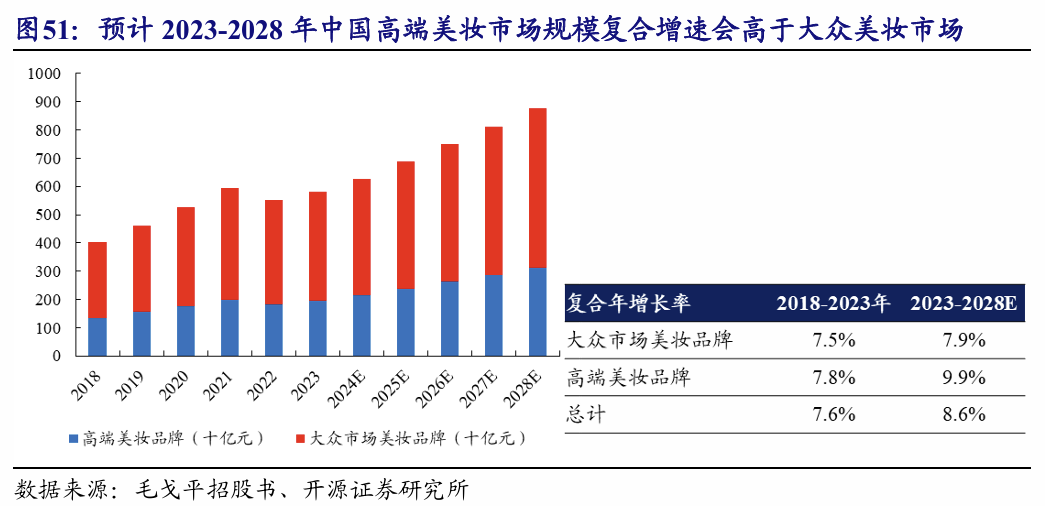 文化自信提供情感溢价,妆养一体构筑产品壁垒。(1)“妆养一体”和“高端化”是为了满足消费者更高阶的悦己需求:消费者心智成熟,对底妆的养肤需求升级,成为驱动增长和提升客单价的主力;同时,消费者愿意为高端化(例如“东方美学”、卓越品质和专业印象)支付溢价,根据Frost&Sullivan数据,预计2023-2028年高端美妆品牌市场规模的复合年增长率高达9.9%,高于大众市场美妆品牌,目前头部国货(如毛戈平)已成功站稳高端价格带;(2)文化自信的深层体现:新一代消费者的高度文化自信,为融合了东方美学的国潮彩妆提供了天然市场土壤和强大情感连接点,也是国际品牌难以复制的“文化溢价”和品牌护城河。