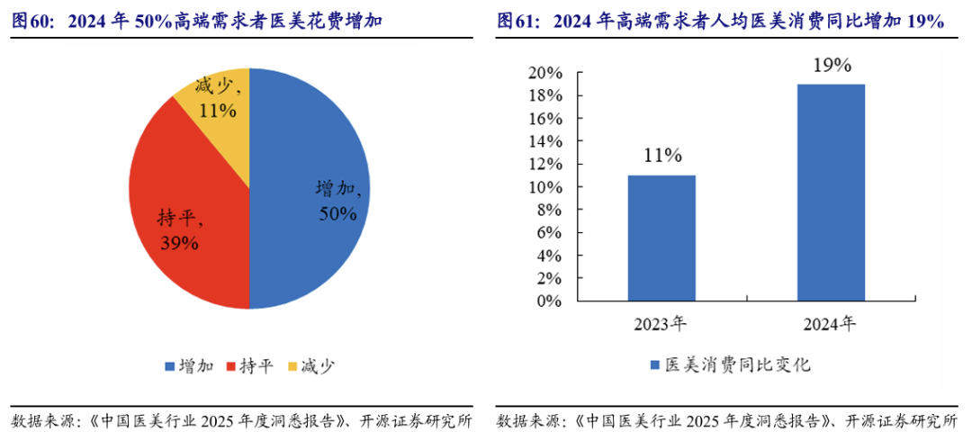 医美高端消费人群需求稳定、消费韧性强。分消费群体看,根据德勤&艾尔建的数据,2024年有89%的中高收入医美需求者维持或增加了医美消费金额,且高端需求者的整体消费金额同比+19%,同比增速超过2023年。可以看出,医美高端消费人群的需求更加稳定,预计对高端差异化医美产品的需求韧性也较为显著。