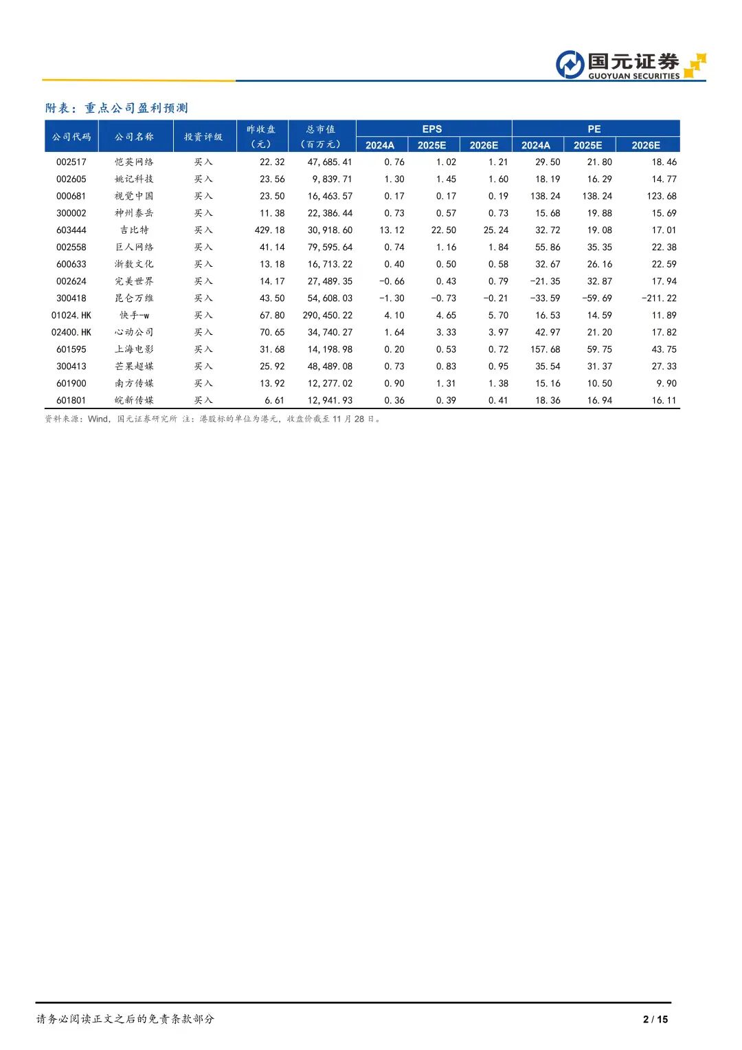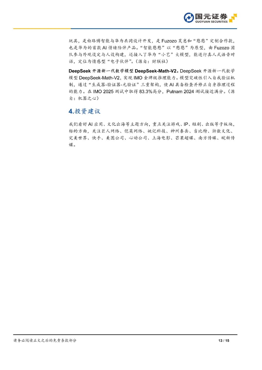 我们看好AI应用、文化出海等主题方向,重点关注游戏、IP、短剧、出版等子板块,标的方面,关注巨人网络、恺英网络、姚记科技、神州泰岳、吉比特、浙数文化、完美世界、快手、美图公司、心动公司、上海电影、芒果超媒、南方传媒、皖新传媒。
