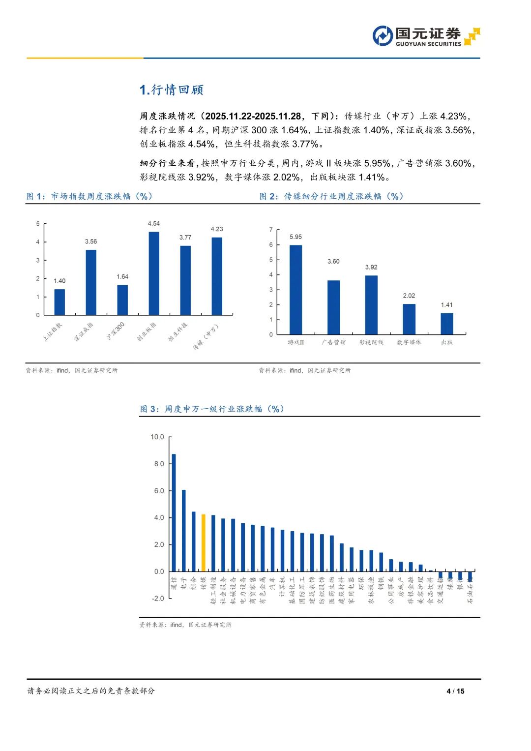 周度涨跌情况(2025.11.22-2025.11.28,下同):传媒行业(申万)上涨4.23%,排名行业第4名。读者传媒、名臣健康、新华都、读客文化和蓝色光标表现较优,恒生科技成分股中传媒行业本周阅文集团(周涨幅7.69%)和哔哩哔哩-W(周涨幅7.44%)表现较好。
