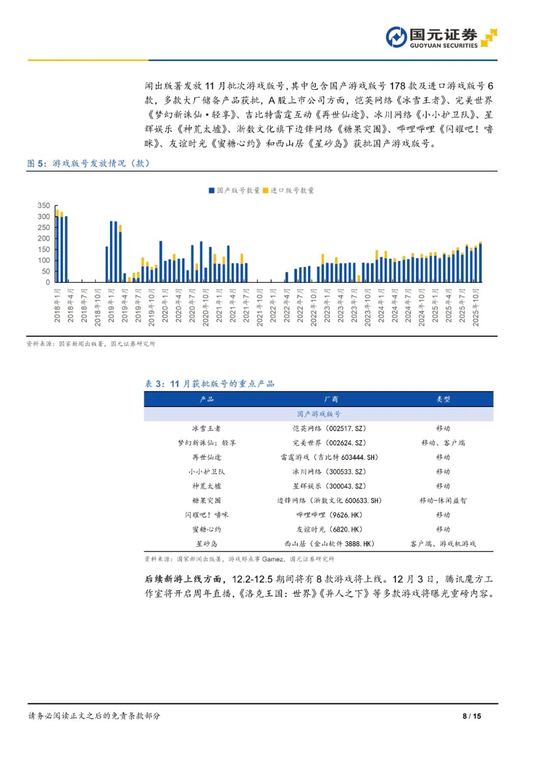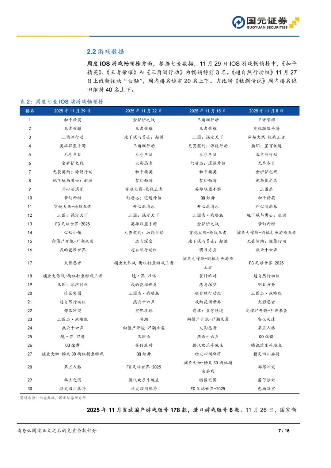 游戏:周度IOS游戏畅销榜方面,根据七麦数据,11月29日IOS游戏畅销榜中,《和平精英》、《王者荣耀》和《三角洲行动》为畅销榜前3名。《超自然行动组》11月27日上线新怪物“白鼬”。国家新闻出版署发放11月批次游戏版号,其中包含国产游戏版号178款及进口游戏版号6款,多款大厂储备产品获批,A股上市公司方面,恺英网络《冰雪王者》、完美世界《梦幻新诛仙·轻享》、吉比特雷霆互动《再世仙途》、冰川网络《小小护卫队》、星辉娱乐《神荒太墟》、浙数文化旗下边锋网络《糖果突围》、哔哩哔哩《闪耀吧!噜眯》、友谊时光《蜜糖心约》和西山居《星砂岛》获批国产游戏版号。