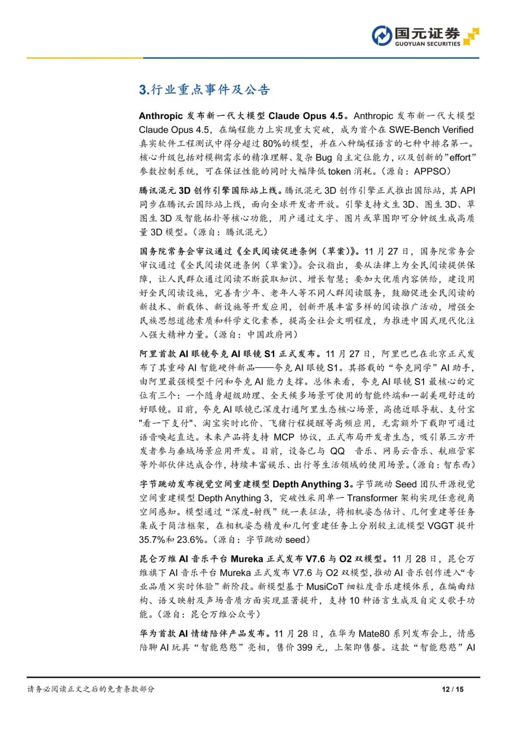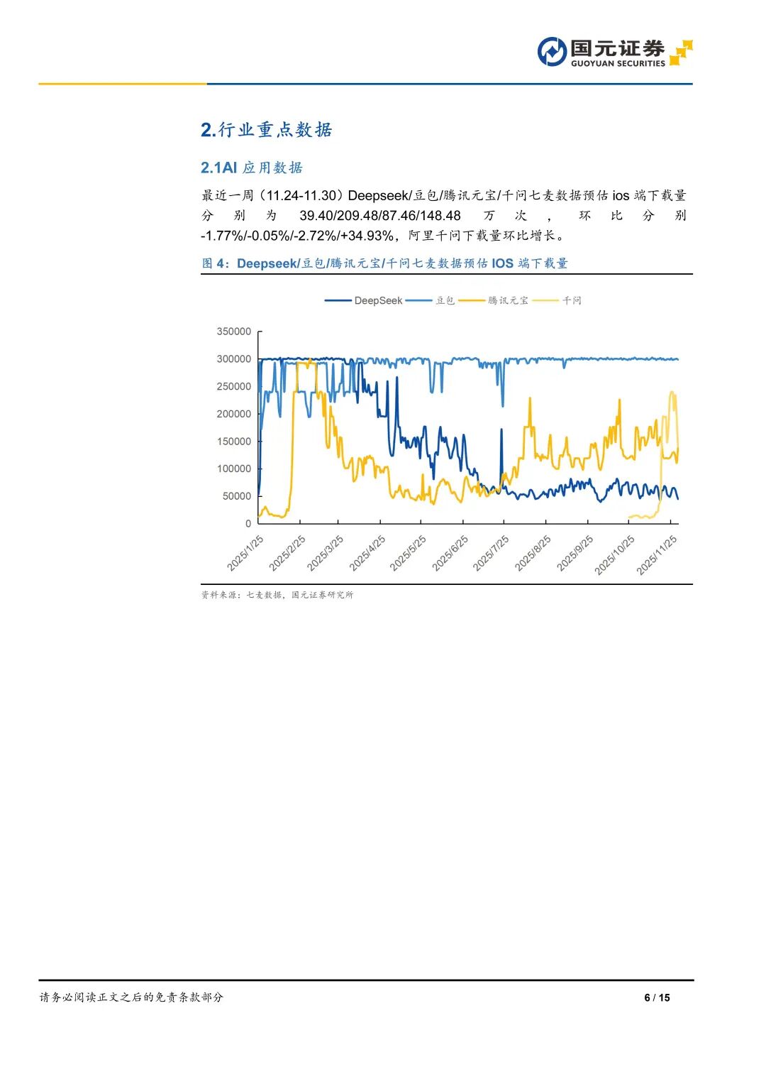AI应用:最近一周(11.24-11.30)Deepseek/豆包/腾讯元宝/千问七麦数据预估ios端下载量分别为39.40/209.48/87.46/148.48万次,环比分别-1.77%/-0.05%/-2.72%/+34.93%,阿里千问下载量环比增长。AI应用事件方面,Anthropic发布新一代大模型Claude Opus 4.5,腾讯混元3D创作引擎国际站上线,阿里首款AI眼镜夸克AI眼镜S1正式发布,字节跳动发布视觉空间重建模型Depth Anything 3,昆仑万维AI音乐平台Mureka正式发布V7.6与O2双模型,华为发布首款AI情绪陪伴产品,DeepSeek开源新一代数学模型DeepSeek-Math-V2。
