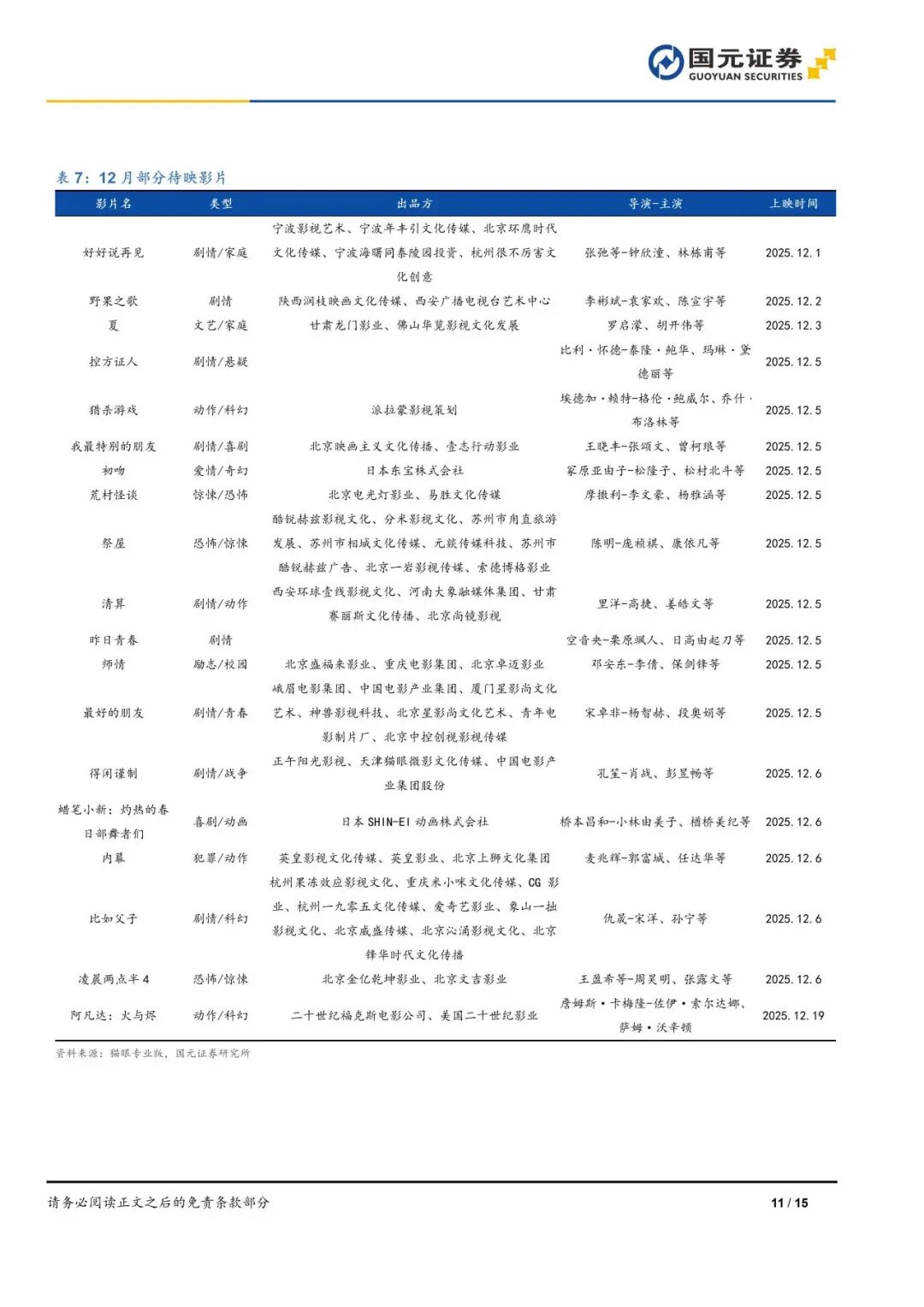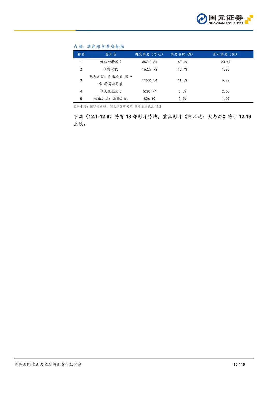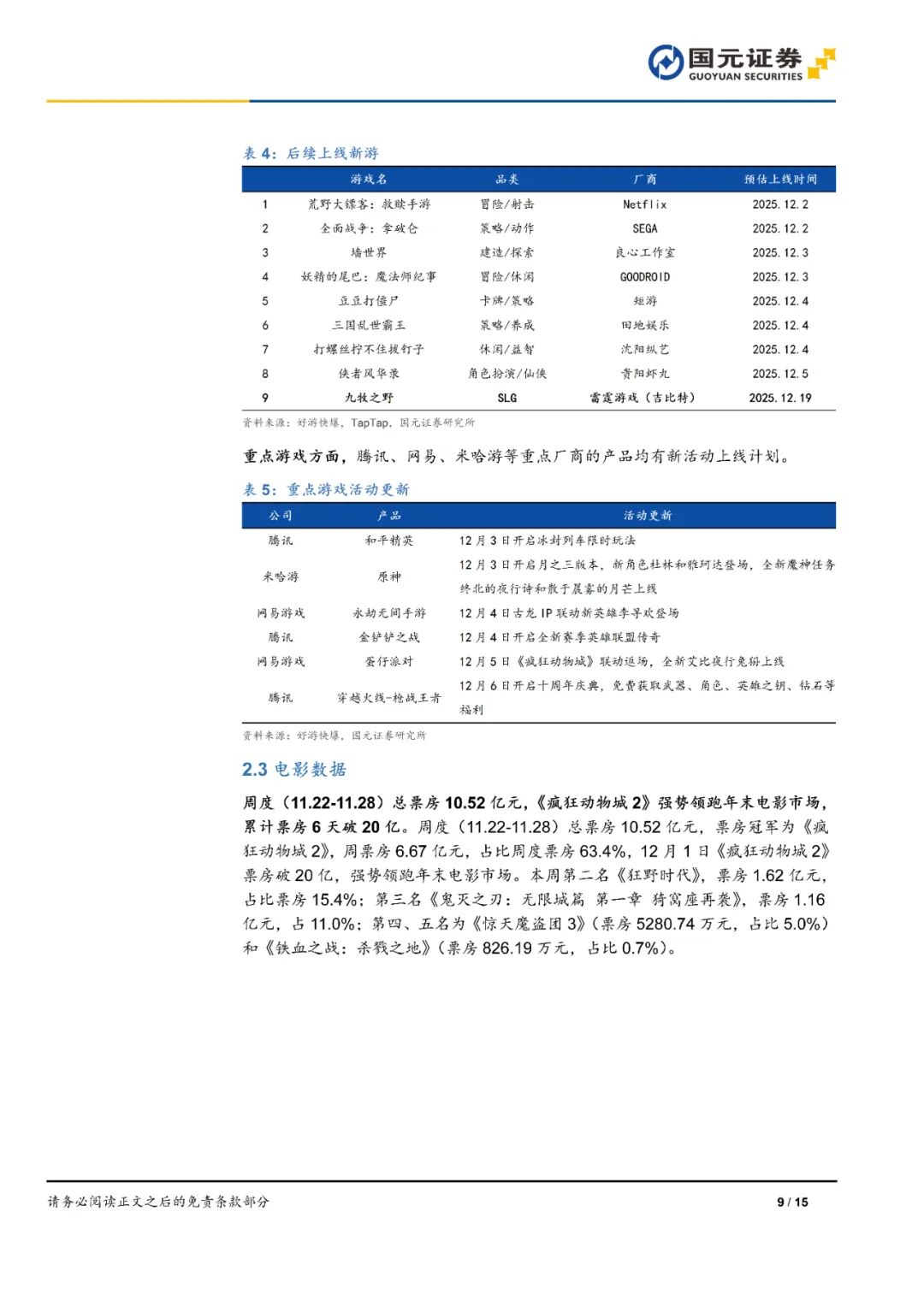 影视:周度(11.22-11.28)电影总票房10.52亿元,票房冠军为《疯狂动物城2》,周票房6.67亿元,占比周度票房63.4%,上映6天累计票房破20亿,强势领跑年末电影市场。后续(12.1-12.6)将有18部影片待映,重点影片《阿凡达:火与烬》将于12.19上映。