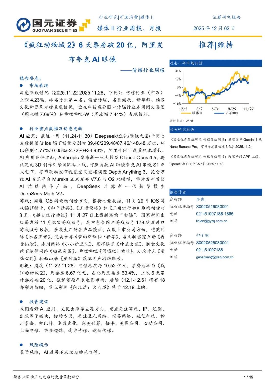 本报告摘自国元证券2025年12月2日已发布的《《疯狂动物城2》6天票房破20亿,阿里发布夸克AI眼镜——传媒行业周报》,具体报告及分析内容请详见报告。若因对报告的摘编等产生歧义,应以报告发布当日的完整内容为准。