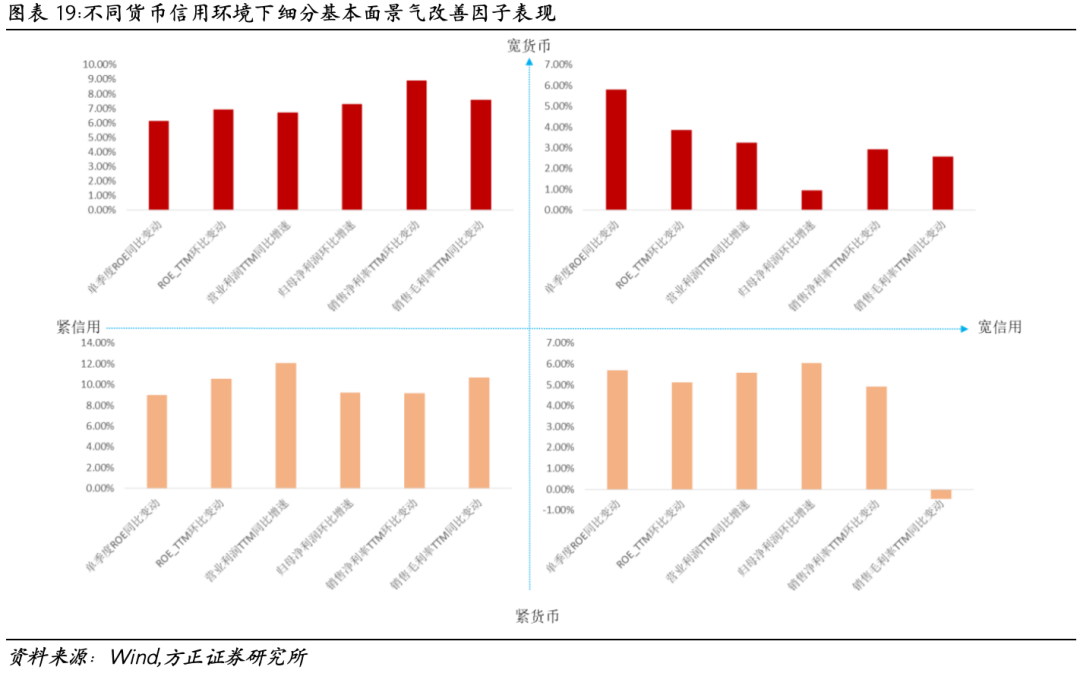 我们筛选上述因子中表现较好的部分因子进行分市场环境研究,发现所有细分因子在紧货币紧信用阶段的表现均最为出色,而宽货币宽信用阶段部分因子出现失效的情况。