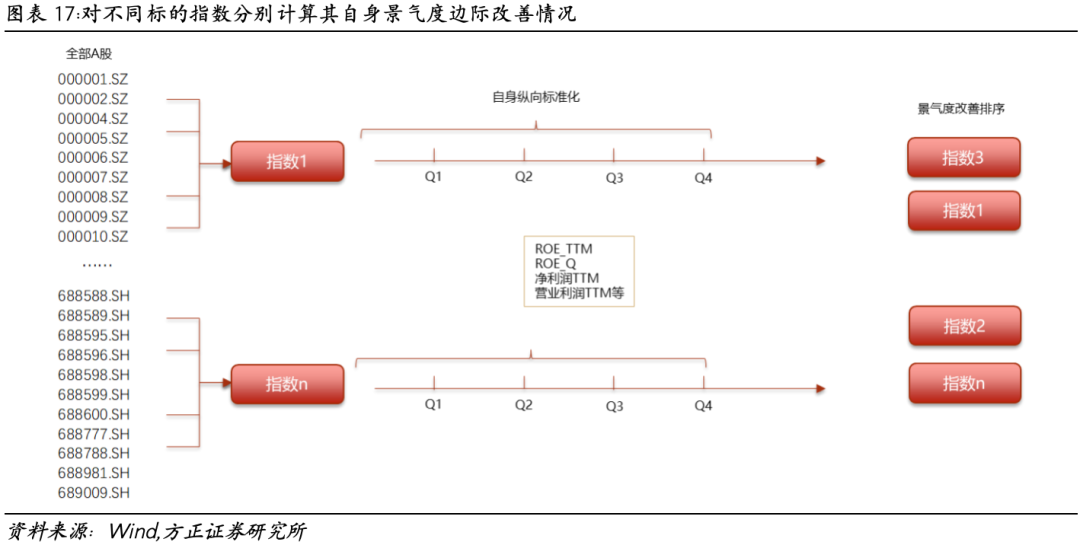通过上市公司财务数据可以判断出企业的盈利情况,行业或板块也类似。对于不同宽基、行业、主题指数,由于成分股的差异较大,直接对比指数的财务指标会存在较大的偏差,因此,我们在对指数构建盈利因子时均需考虑其业绩的边际变化情况。