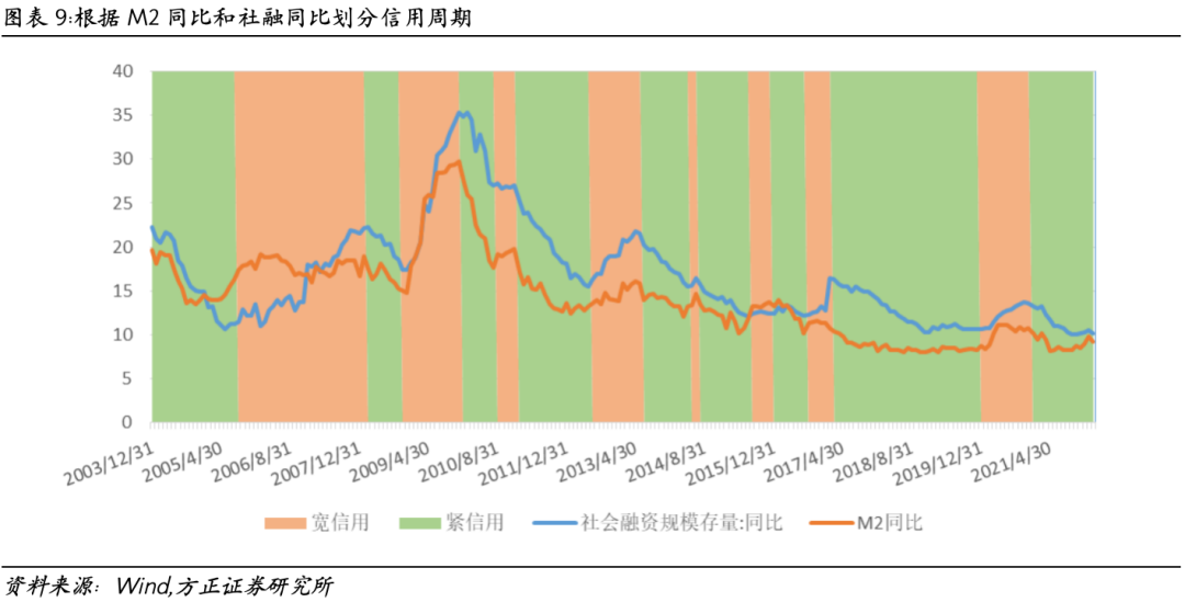 对于信用周期的划分,我们结合广义货币供应量M2同比增速和社会融资总量余额同比增速进行划分,当两个同比指标同时上行,可以认为进入宽信用周期,同时下行则为紧信用周期,如两个指标发生背离,则使用上一期的状态作为当前状态判断。
