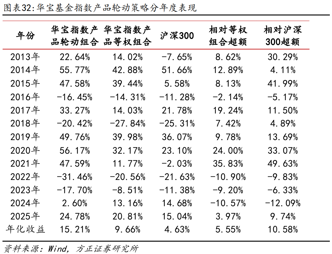 上述指数产品轮动策略不仅在全市场ETF产品范围内表现较好,在特定指数范围内的表现也较为出色。在报告《基于华宝基金指数产品的轮动策略构建——指数基金资产配置系列之二》中,我们构建了华宝基金指数产品的轮动策略。该模型历史表现较为出色,轮动组合相较于等权组合、沪深300指数具有明显的超额收益,年化超额分别约为5.55%、10.58%。2025年11月,轮动组合下跌1.16%,同期等权组合下跌2.93%,沪深300指数下跌2.46%,轮动组合战胜等权组合1.77%。