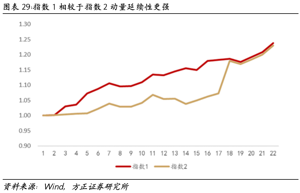 动量延续性因子的核心思想是,对于短期内出现大涨的板块,我们认为其延续性相对较弱,而缓慢的累积式上涨,后续延续性可能更强(如下图所示,指数1相较于指数2的动量延续性更强)。我们在夏普比率的基础上,剥离掉区间最大涨幅来进一步刻画动量延续性。