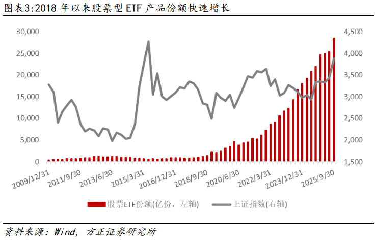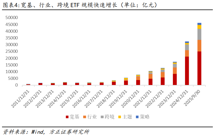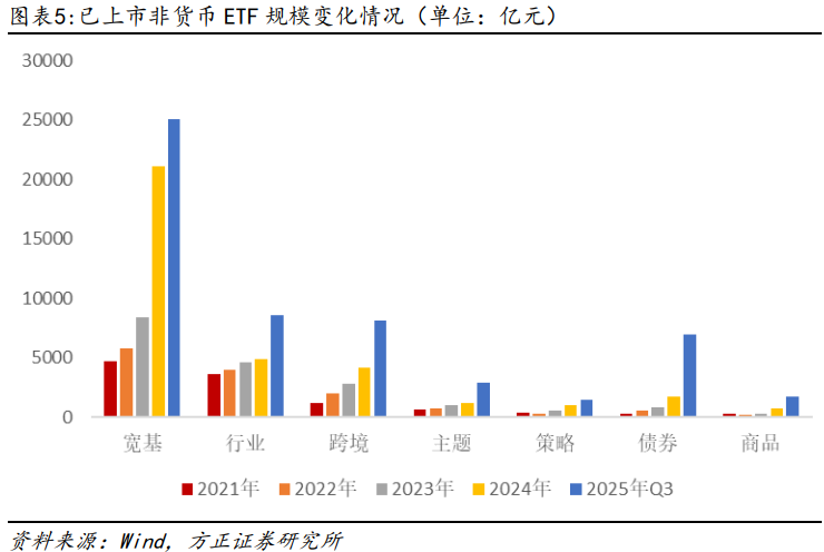 从产品类型来看,宽基ETF一直是第一大产品类型,2024年以来宽基ETF产品规模大幅增长,截至2025年Q3,宽基ETF规模合计25046亿元,市场份额占比约为46%。2020年以来行业ETF迎来快速增长,规模大幅上升,截至2025年Q3,行业ETF规模合计8533亿元,占比16%。